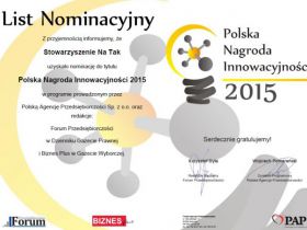 Stowarzyszenie Na Tak otrzymało nominację do tytułu Polska Nagroda Innowacyjności 2015.