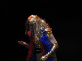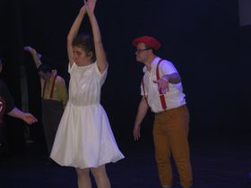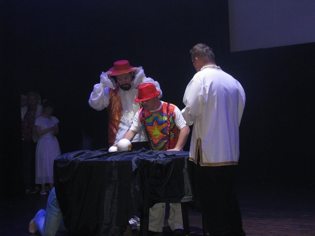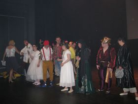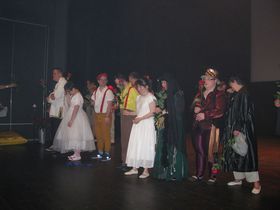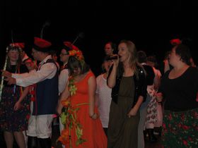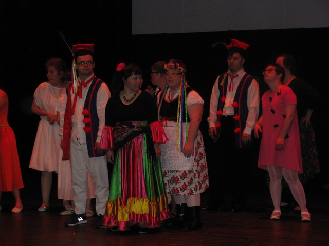 Akcja na scenie toczyła się wartko i z ogromną przyjemnością obejrzeliśmy jak zespół taneczny Promyk prezentuje kolejno stroje, w których występował w układach tanecznych przez ostatnie parę lat. Pojawili się przed nami w strojach murzyńskich, flamenco, samby, ,rock'n'roll, bollywood, country i Rajskim Ptaku, a na koniec zatańczyli przepięknego poloneza.